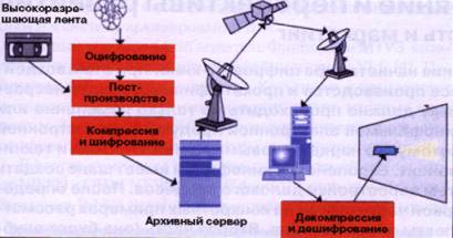 3.3. Демонстрационное устройство CyberCinema. В рамках европейского проекта в 1997-1998 гг. создатели и поставщики фильмов, а также поставщики техники скооперировались для разработки «демонстратора» цифрового кино, доступного для широких слоев населения (рис. 2). Демонстрация успешно прошла осенью 1998 г. в связи с фестивалем детского кино. В частности, можно было проверить на практике функционирование многоязычных звуковых дорожек. Передача происходила по четырем мультиплексным потокам MPEG-2 MP@ML через спутник и принималась станцией Deutsche Telekom.
