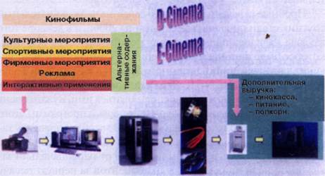 дисплей. Платформа E-Cinema фирмы MediaBroadcast, дочернего предприятия Telekom, была создана для «живых» трансляций и вместе с тем — для передачи альтернативного содержания. В центре внимания была прямая трансляция концерта группы Бон Джови в сентябре 2002 г. в 25 кинотеатрах. Фирма Odeon Digital Cinema была инициатором создания самой большой киноцепи в Великобритании (Odeon) совместно с фирмой Quantum Digital для показа широкой публике мюзиклов, рок-концертов или спортивных мероприятий. Пример — прямая трансляция матчей чемпионата мира по футболу 9. Позиции